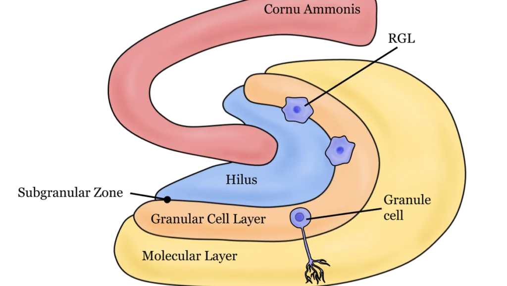 Adult hippocampal neurogenesis occurs in the dentate gyrus of the hippocampus. Even though this is simply referred to as “Hippocampal Neurogenesis”, it is important to note that this occurs only in the dentate gyrus, and not the other subdivisions of the hippocampus. It also generates only one type of neuron, which is the granule cell. Granule cells are relatively small neurons, with small cell bodies. Each one contains about 3-4 short dendrites, and each dendrite contains a claw-like structure at its end. Each granule cell also contains one narrow axon, and in the hippocampus, this axon is glutamatergic. This means that the neurotransmitter glutamate, the primary excitatory neurotransmitter of the nervous system, is stored in its synaptic vesicles and released into neighboring neurons. Granule cells in the dentate gyrus receive excitatory input from the entorhinal cortex, a region of the brain which functions a network of a person’s long-term, short-term, and spatial memories, as well as their perception of time. They send excitatory output to the CA3 region of the hippocampus, a large circuit that stores episodic memories and spatial representations.