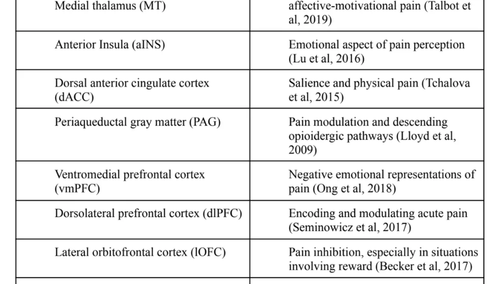 cingulate cortex (avoidance of pain), and periaqueductal gray matter (pain regulation and